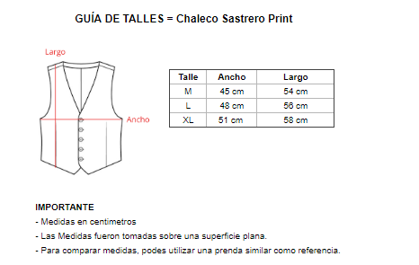 Nuestro chaleco Sastrero Print combina el corte clásico que amamos con un estampado que eleva cualquier outfit. Forrado por dentro para un acabado impecable y confeccionado en tela que no se arruga, es la prenda perfecta para usar sola o sobre remeras y camisas.