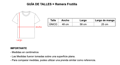 De algodón 100%, con estampa de Frutilla que aporta un guiño divertido y canchero a tu look. Su diseño de talle único se adapta a todos los cuerpos, convirtiéndola en la remera ideal para sumar a tus jeans, faldas o shorts favoritos.